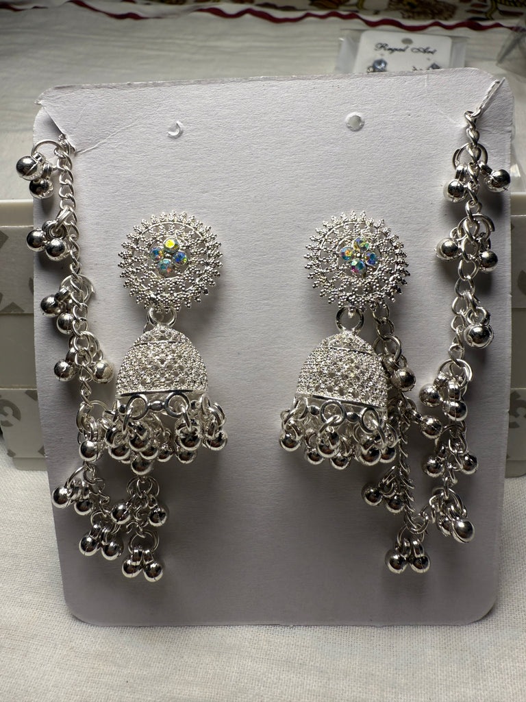 Make a dazzling statement with these ornate, heavy-look silver-tone jhumka earrings. The design features a multi-layered, sunburst-style stud embellished with tiny silver beads and a central multi-colored/AB (Aurora Borealis) crystal for a subtle flash of color. Below the stud hangs a classic dome-shaped jhumka bell, densely covered in tiny beads and finished with a cluster of ghungroo bells for beautiful sound and movement.