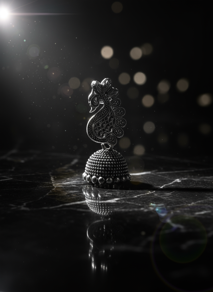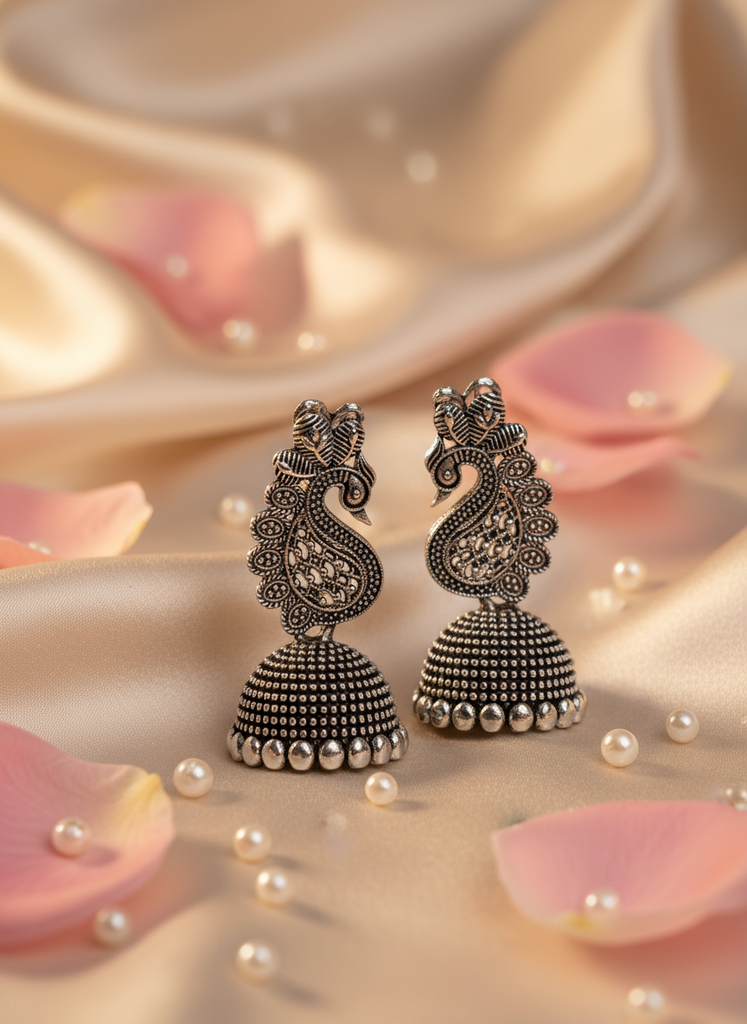 Turn heads with these beautiful oxidized silver-tone jhumka earrings. They feature an ornate peacock stud connected to a textured, dome-shaped bell. The antique finish gives them a rich, vintage look. Lightweight and versatile—perfect for adding a traditional touch to any outfit.