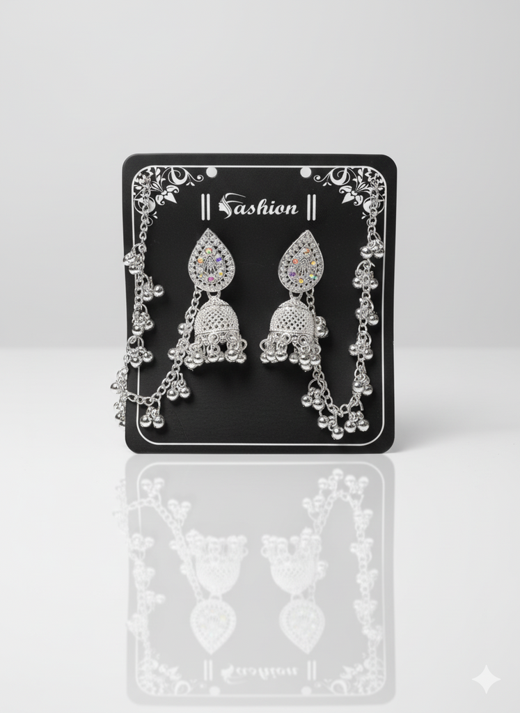 Add a touch of dramatic flair with these beautiful silver-tone dangler jhumkas. They feature a highly detailed bell with a sparkling, iridescent crystal stud. The unique, flowing ghungroo chain attached to the earring adds a glamorous, cascading effect. Lightweight enough for comfort but dramatic enough to turn heads!